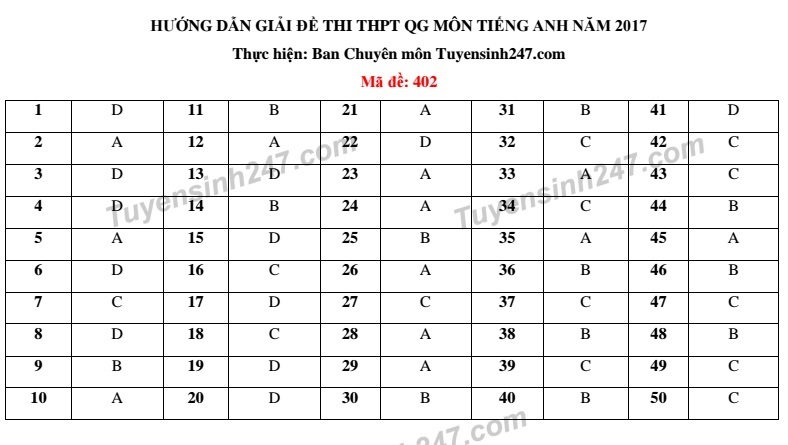Lời giải tham khảo môn Tiếng Anh mã đề 402