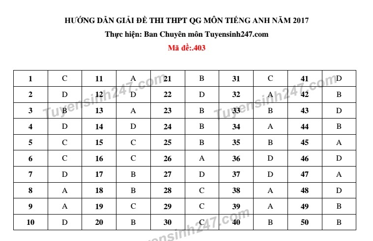 Lời giải tham khảo môn Tiếng Anh mã đề 403