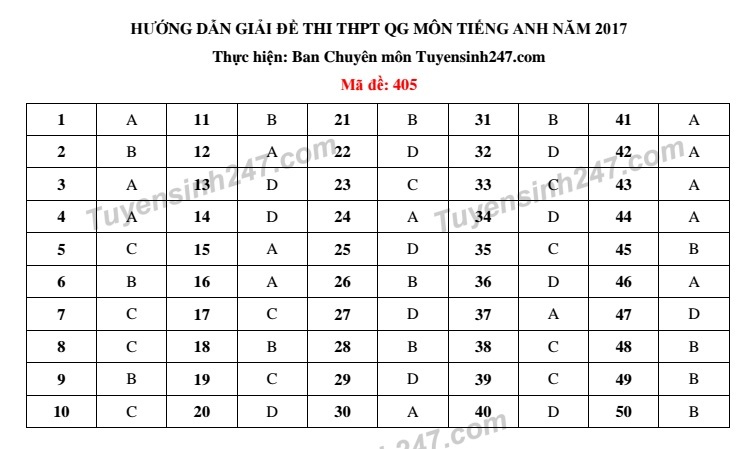 Lời giải tham khảo môn Tiếng Anh mã đề 405