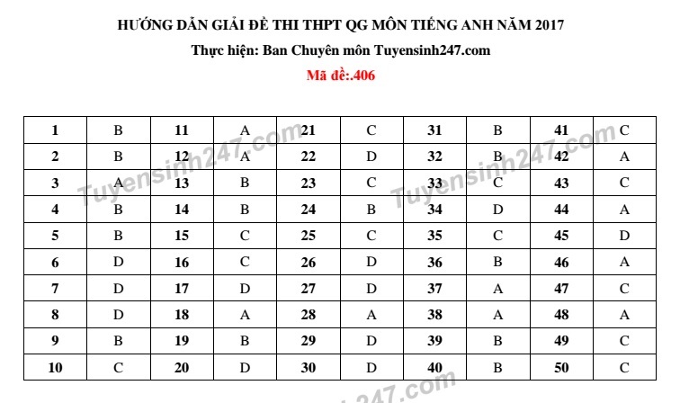 Lời giải tham khảo môn Tiếng Anh mã đề 406