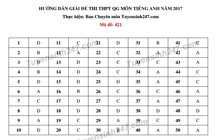 Lời giải tham khảo môn Tiếng Anh mã đề 421