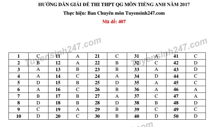 Lời giải tham khảo môn Tiếng Anh mã đề 407