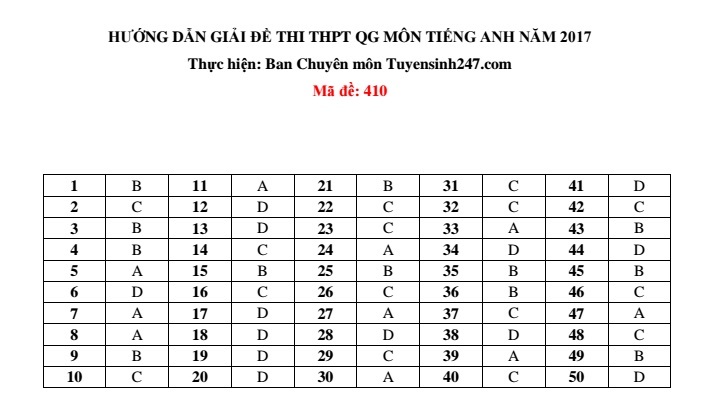 Lời giải tham khảo môn Tiếng Anh mã đề 410