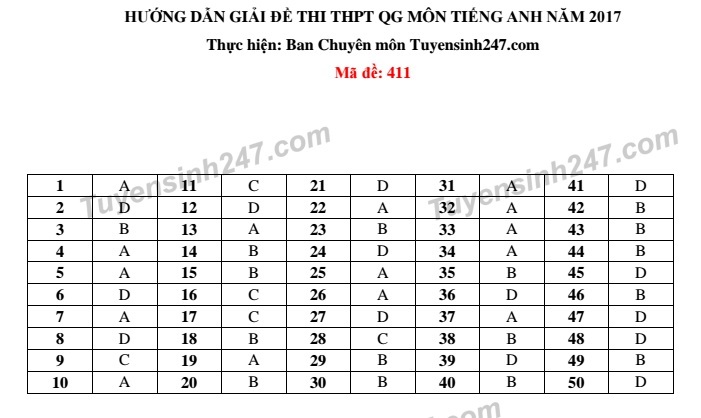 Lời giải tham khảo môn Tiếng Anh mã đề 411