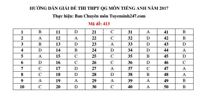Lời giải tham khảo môn Tiếng Anh mã đề 413