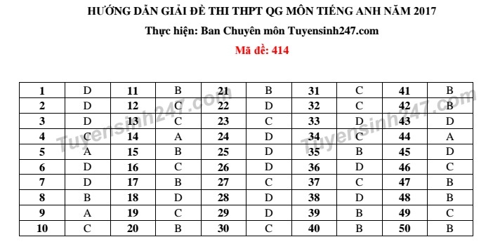 Lời giải tham khảo môn Tiếng Anh mã đề 414