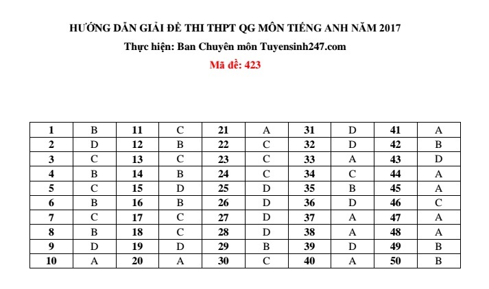 Lời giải tham khảo môn Tiếng Anh mã đề 423