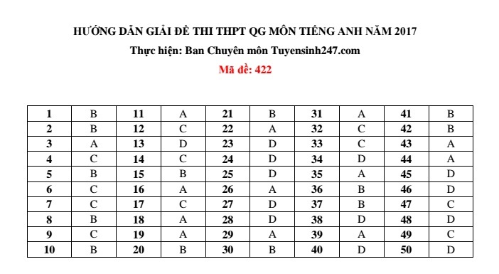 Lời giải tham khảo môn Tiếng Anh mã đề 422