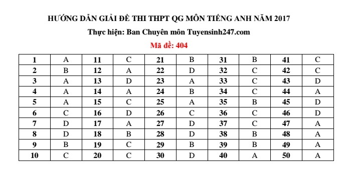 Lời giải tham khảo môn Tiếng Anh mã đề 404