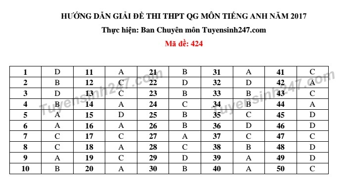 Lời giải tham khảo môn Tiếng Anh mã đề 424