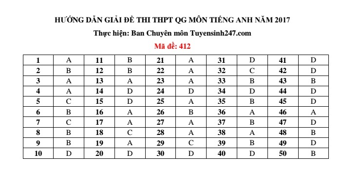 Lời giải tham khảo môn Tiếng Anh mã đề 412