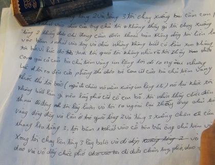 “ …Tôi chạy xuống cầm con dao chém một nhát vào đầu ông chủ, không thấy gì tôi chạy xuống tầng 2 thấy đứa chị đang cầm điện thoại bàn không dây, tôi liền lao vào băm một nhát vào tay và đầu nhưng không biết có làm sao không bởi vì lúc đó trời tối quá, tôi không nhìn rõ.