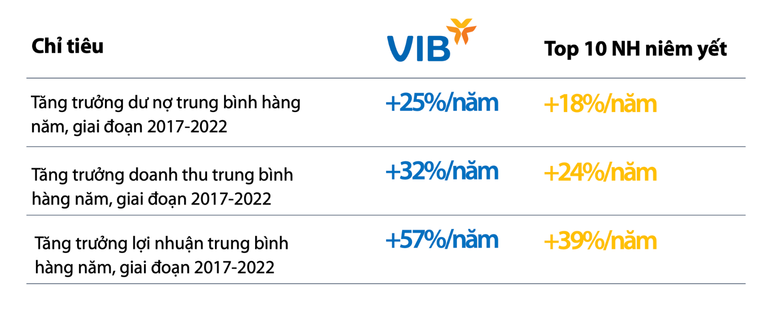 Kết quả tích cực của năm 2022 đã đóng góp vào hiệu quả tổng thể trong 6 năm chuyển đổi (2017-2022), đưa VIB trở thành một trong những ngân hàng dẫn đầu về tăng trưởng quy mô tài sản, tăng trưởng doanh thu, quản trị chi phí hiệu quả và kiểm soát rủi ro chặt chẽ. Lợi nhuận của VIB đạt mức tăng trưởng bình quân (CAGR) là 57% mỗi năm trong suốt giai đoạn 6 năm qua.