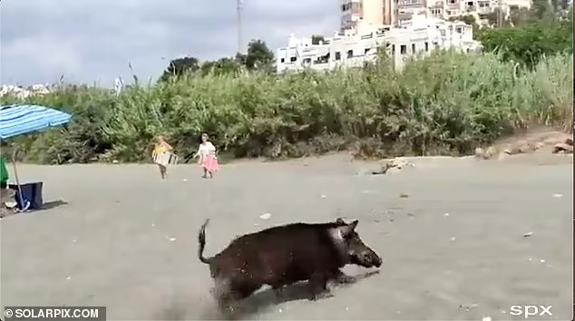 Con lợn rừng hung hãn khoảng 3 tuổi này xuất hiện ở bãi biển nổi tiếng Benajarafe, cuối phía đông của Costa del Sol, cách Malaga nửa giờ lái xe.