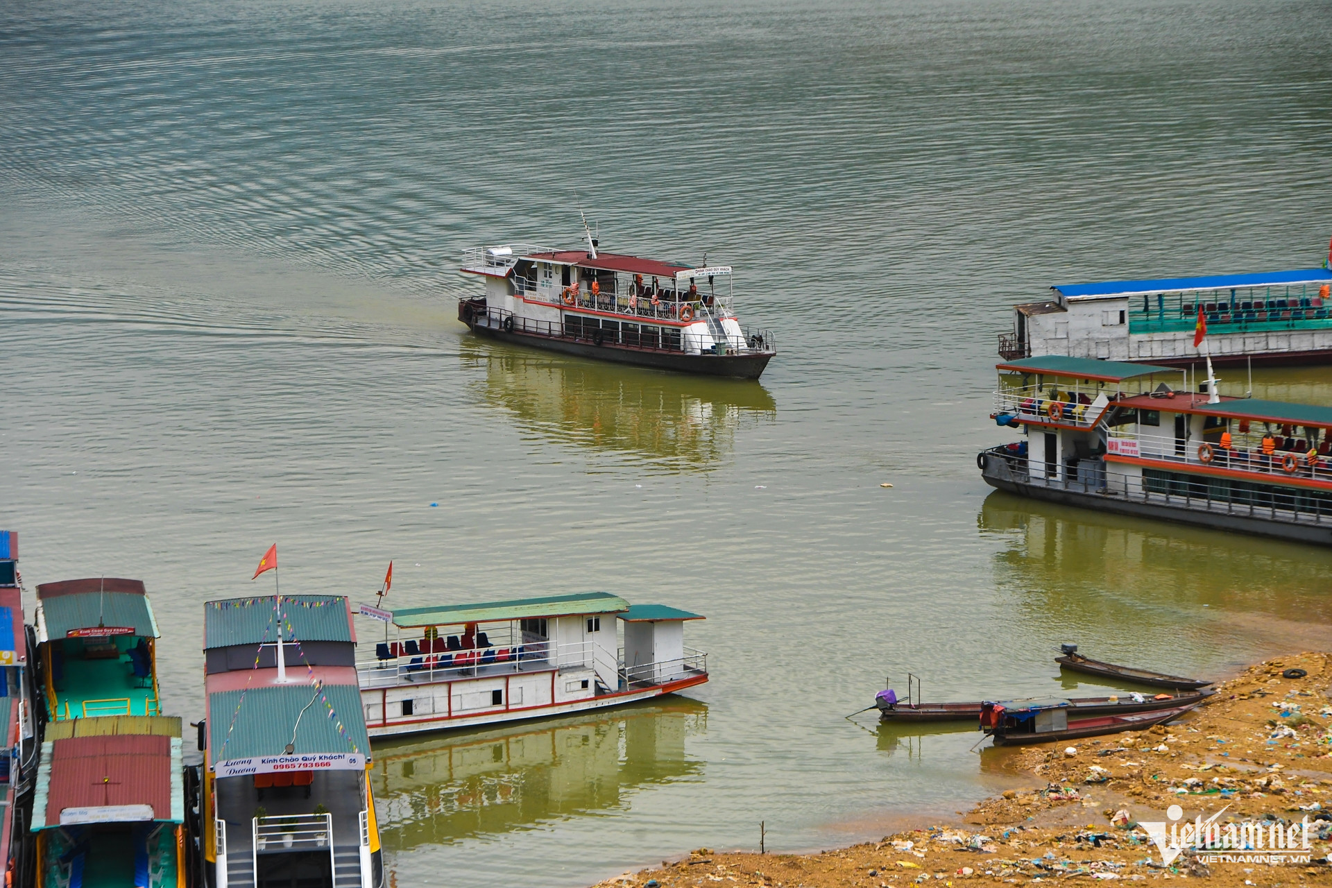 10 năm đưa khách du lịch trên đập thủy điện Hòa Bình, bà Trần Thị Thoa chưa từng thấy mực nước hồ cạn sâu đến vậy. Thuyền bè khó di chuyển do bám bùn, khách ít, bà và nhiều người khác quyết định neo đậu, nghỉ việc vài tuần.