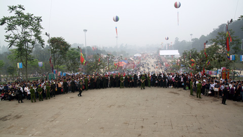 Từ 9h sáng, cổng chính vào Đền Hùng bắt đầu bị chen chặt cứng
