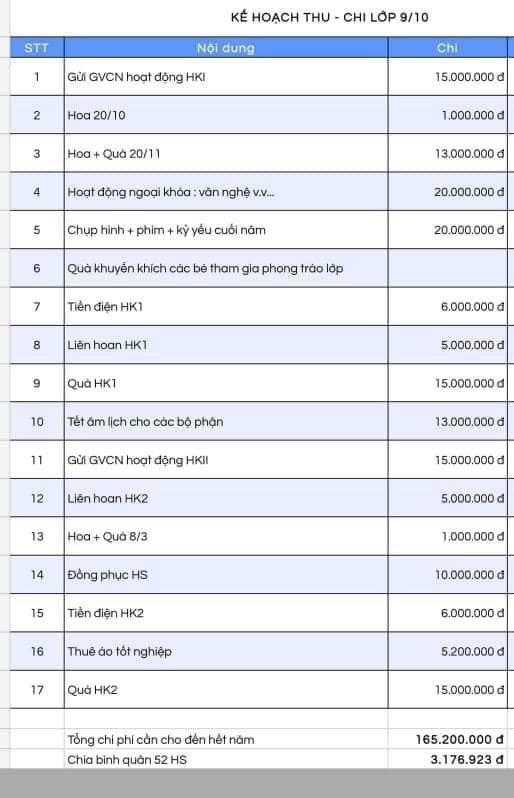 Tổng chi phí cần cho đến hết cả năm học là 165.200.000 đồng. Lớp có 52 học sinh, dự kiến mỗi em đóng 3,176 triệu đồng.