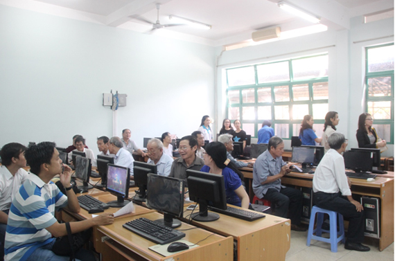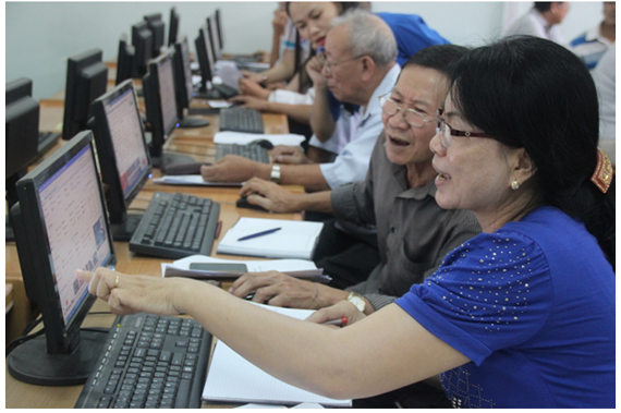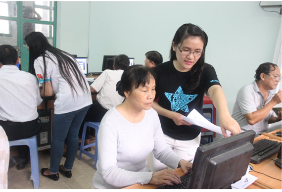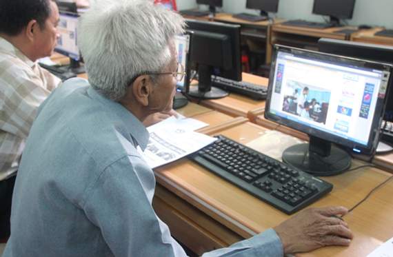 Tình nguyện viên của trang web Bắc đẩu hướng dẫn các cô chú thực hành gửi email, đọc báo.