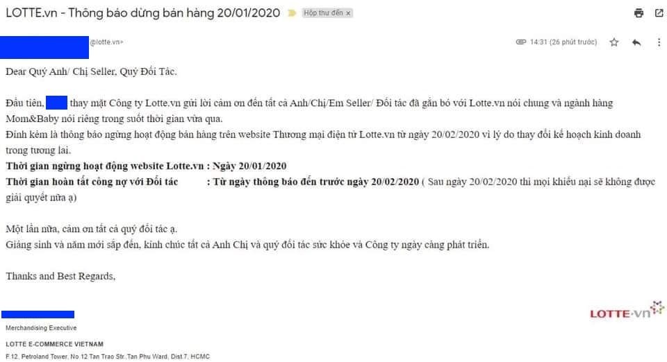 Lotte Mart xác nhận sàn thương mại điện tử Lotte.vn sẽ chính thức ngưng bán hàng từ ngày 20/1/2020. Trước đó, đại diện một ngành hàng của Lotte.vn đã gửi email đến các đối tác thông báo về nội dung này.