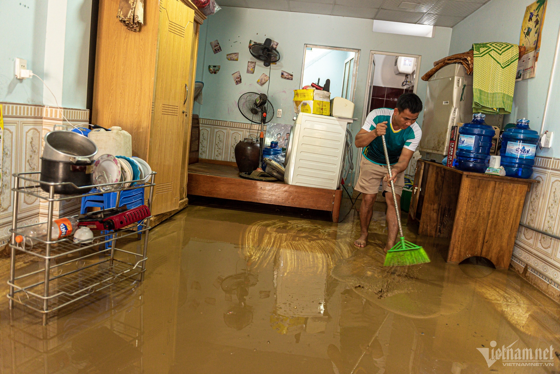 Khi lũ rút dần, nhiều gia đình huy động tất cả người thân để tát nước, quét và dọn dẹp nhà cửa, đẩy bùn đất ra ngoài.