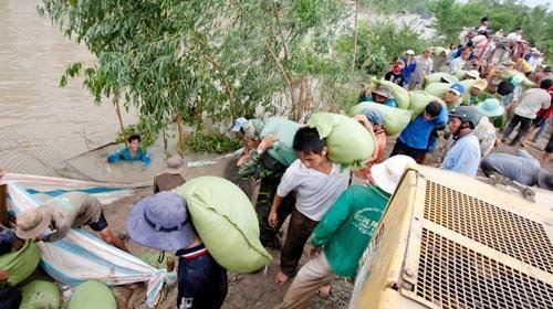 | Hàng trăm bao cát được bộ đội và người dân địa phương vận chuyển đến nơi vỡ đê (Ảnh: Tuổi Trẻ) |