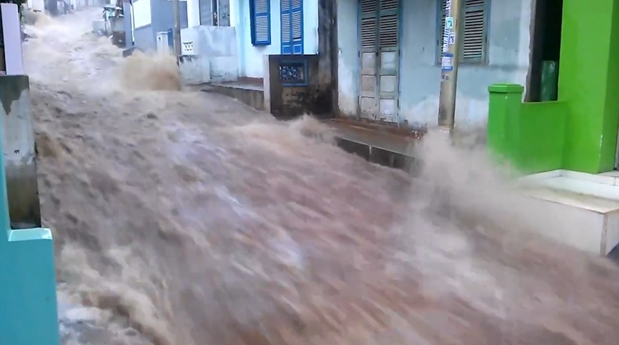 Ghi nhận, cơn mưa nặng hạt đã biến nhiều tuyến phố thành sông, nước ngập đến đầu gối người lớn. Tại nhiều nhiều tuyến đồi dốc, nước chảy như thác sẵn sàng cuốn trôi bất cứ thứ gì trên đường.