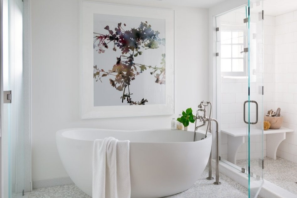 Khi ngâm mình trong bồn tắm, nhiều người có thói quen ngắm nhìn tranh, ảnh để cảm thấy thư giãn hơn. Vì thế, trong phòng tắm, bạn có thể chọn những tác phẩm tạo cảm giác thư thái, yên bình.