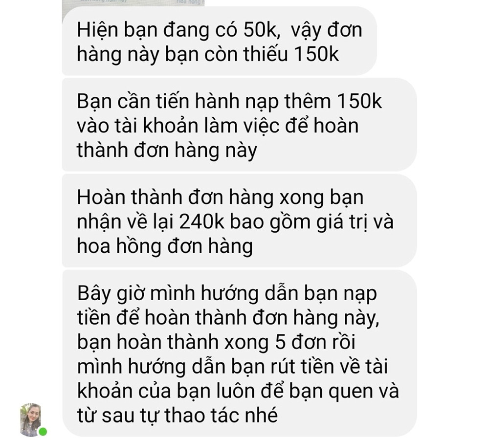 Lần tiếp theo, gặp Fanpage tuyển dụng có tên “Giao hàng tiết kiệm”, chị T. tiếp tục tạo nick mới, vào hỏi thăm. Lần này, “nhà tuyển dụng” hướng dẫn chị làm thủ tục trực tuyến nhanh gọn, nhiệm vụ văn phòng “nhẹ tênh” mà thu nhập rất hấp dẫn. Sau một vòng thì vẫn là chiêu cũ yêu cầu nạp tiền. Từ một người đi tìm việc, chị T. chuyển sang trạng thái tò mò, tiếc số tiền đã bị mất trước đó nên tiếp tục tham gia vào nhóm của trang lừa đảo. Chị nhận ra rằng, những kẻ lừa đảo có rất nhiều chiêu trò, chúng rất cảnh giác khi bị “câu ngược”.
