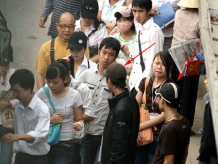 Hai kẻ móc túi (mũ đen, hướng chỉ mũi tên) tại điểm trung chuyển xe buýt Cầu Giấy (Hà Nội)