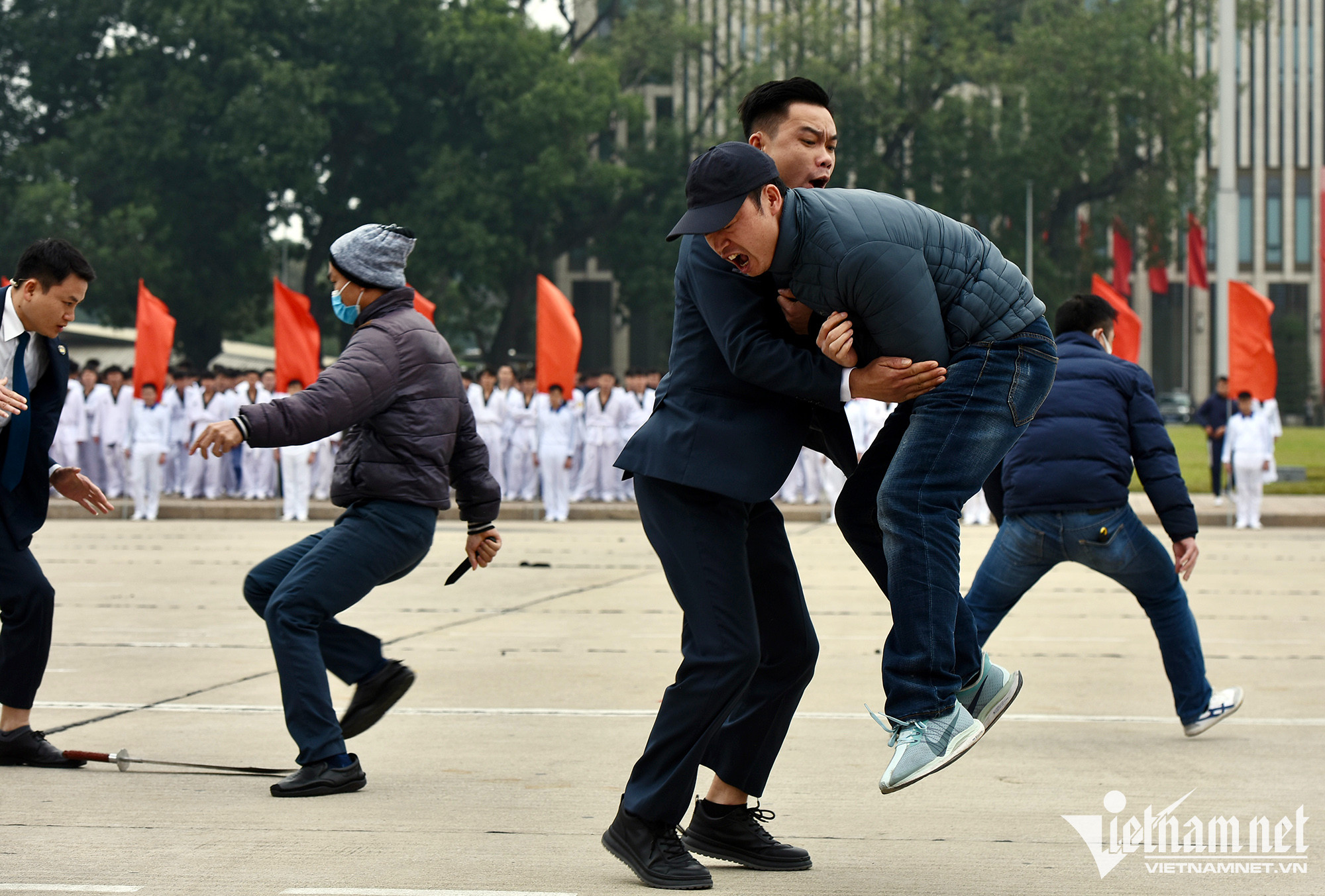 Chục tên khủng bố dùng gậy, dao lao vào tấn công lực lượng cảnh vệ, ngay lập tức các cảnh vệ tiếp cận dùng cặp chống đạn để che chắn, bảo vệ tổng thống nước X. Bằng các động tác võ thuần thục, điêu luyện, lực lượng cảnh vệ đã hạ gục nhiều tên khủng bố trong vài giây. Cùng lúc đó các cảnh vệ tiếp cận dùng cặp chống đạn để che chắn, bảo vệ, đưa tổng thống nước X di chuyển ra xe ô tô.Đây là dịp để đánh giá toàn diện kết quả công tác huấn luyện, chấp hành điều lệnh CAND của các đơn vị cơ sở, đồng thời khẳng định sự trưởng thành lớn mạnh về mọi mặt của lực lượng cảnh vệ.Hội thao quy tụ cán bộ, chiến sĩ, huấn luyện viên, vận động viên trong cả nước tham gia tranh tài ở 21 nội dung của 7 môn thi đấu gồm: Điều lệnh CAND, bắn súng, võ thuật, chiến sĩ Công an khỏe, cầu lông, bóng chuyền và bóng bàn.
