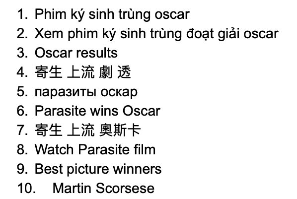 Chưa dừng ở đó, sau lễ trao giải, ở tầm toàn cầu, hai từ khóa đứng đầu Top 10 từ khóa có xu hướng tìm kiếm cao nhất liên quan đến bộ phim Ký Sinh Trùng là tiếng Việt, cho thấy sự quan tâm đáng chú ý của công chúng Việt dành cho bộ phim.