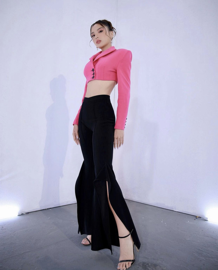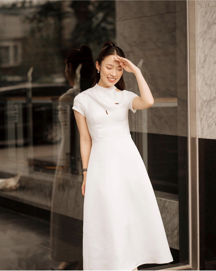 Hồ Ngọc Hà năng động trong set đồ trắng kết hợp cùng giày cao gót tone-sur-tone. Cổ áo khoét sâu cùng sắc xanh đỏ thuần tuý đầy thời thượng.