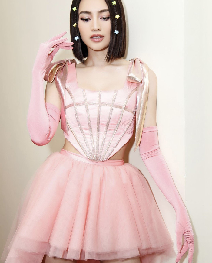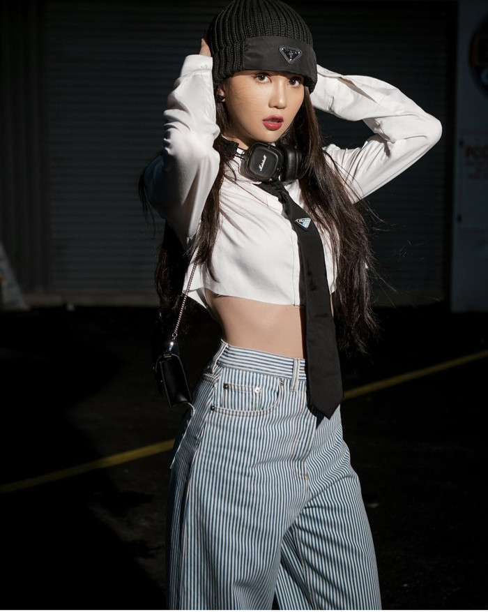 Tú Hảo thời thượng cùng sẻ đồ đen-trắng đậm chất mùa hè. Chân váy ngắn kết hợp cùng áo không tay đầy năng động, mũ nồi với chi tiết đan lát là điểm nhấn đầy nữ tính.