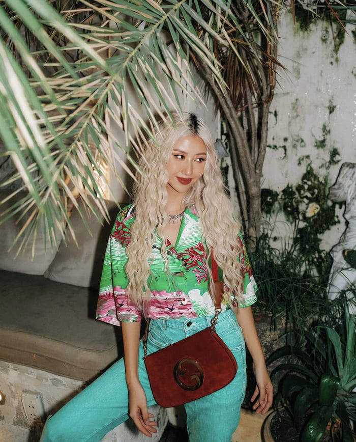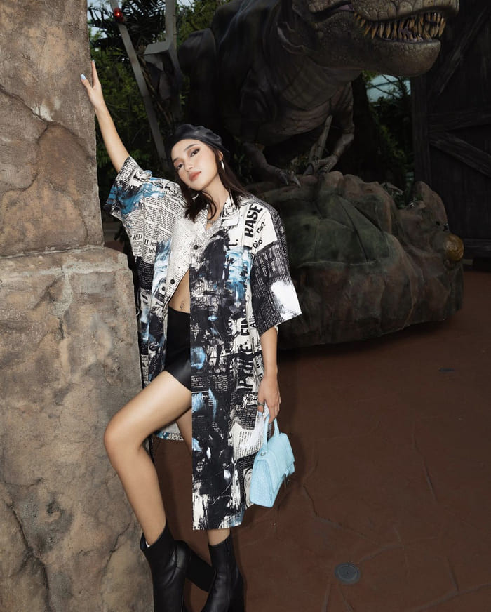 Châu Bùi trong phong cách streetstyle với boots cao cổ và túi xách xanh pastel mang lại nét mạnh mẽ, trẻ trung cho cô nàng.