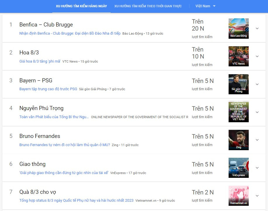 Số lượt tìm kiếm “hoa 8/3” hiện xếp thứ 2 trong bảng xu hướng tìm kiếm hàng ngày, chỉ đứng sau trận đấu bóng đá giữa 2 câu lạc bộ Benfica và Club Brugge.