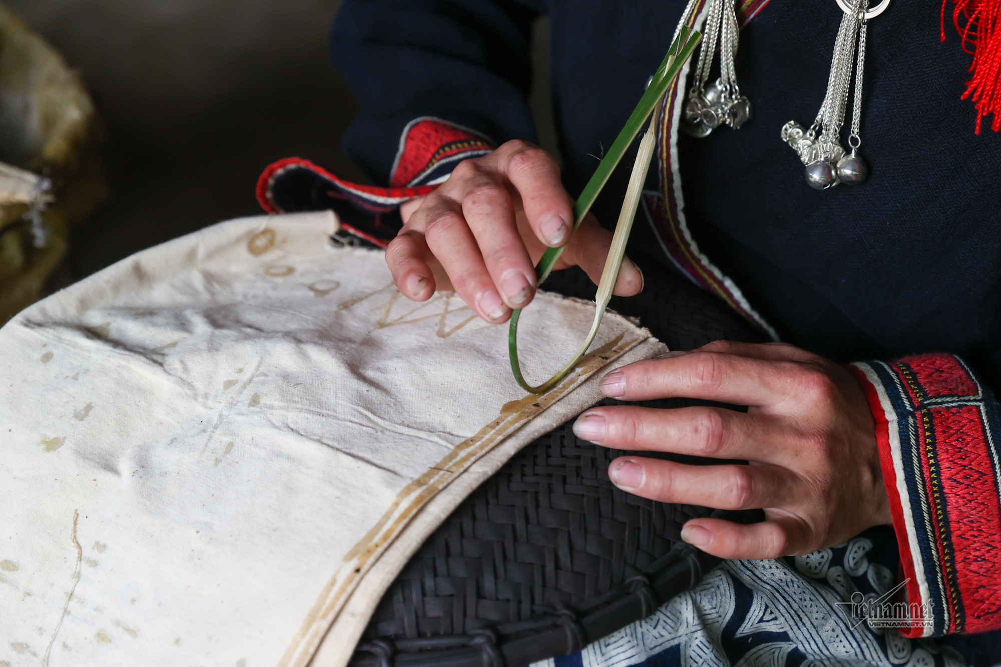 Phụ nữ dân tộc Dao dùng tre vót mỏng, nhúng vào sáp ong đun chảy rồi họa từng đường nét lên vải.