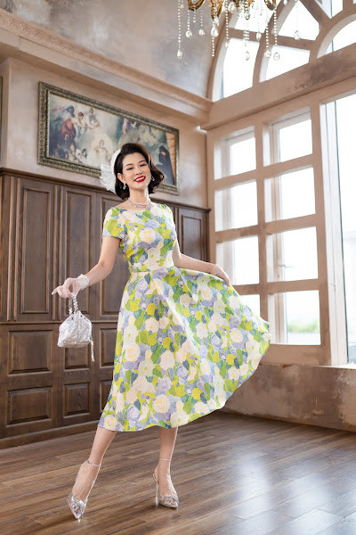 Lưu Huyền Trang xinh đẹp trong thiết kế váy hoa đa màu sắc.