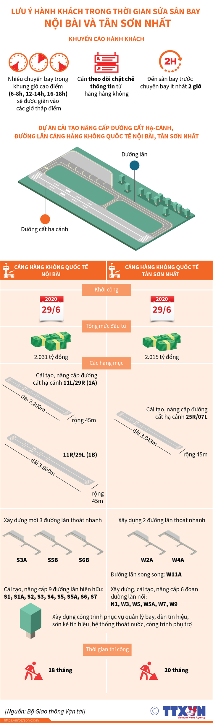 Từ 1/7, sân bay Nội Bài, Hà Nội và Tân Sơn Nhất, TP Hồ Chí Minh đóng cửa 1 đường băng để sửa chữa. Trong thời gian thi công, hành khách được khuyến cáo đến sân bay sớm 2 tiếng trước giờ khởi hành.