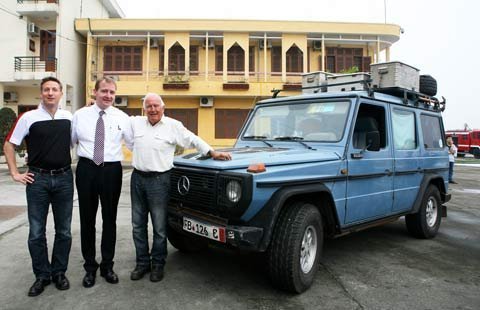 | Từ trái sang: Ông Dirk Adelmann, Giám đốc Kinh doanh & Tiếp thị, Ông Michael Behrens - TGD mới của MBV va ông Gunther Holtorf, nhà du lịch nổi tiếng thế giới trên chiếc xe G-Class |