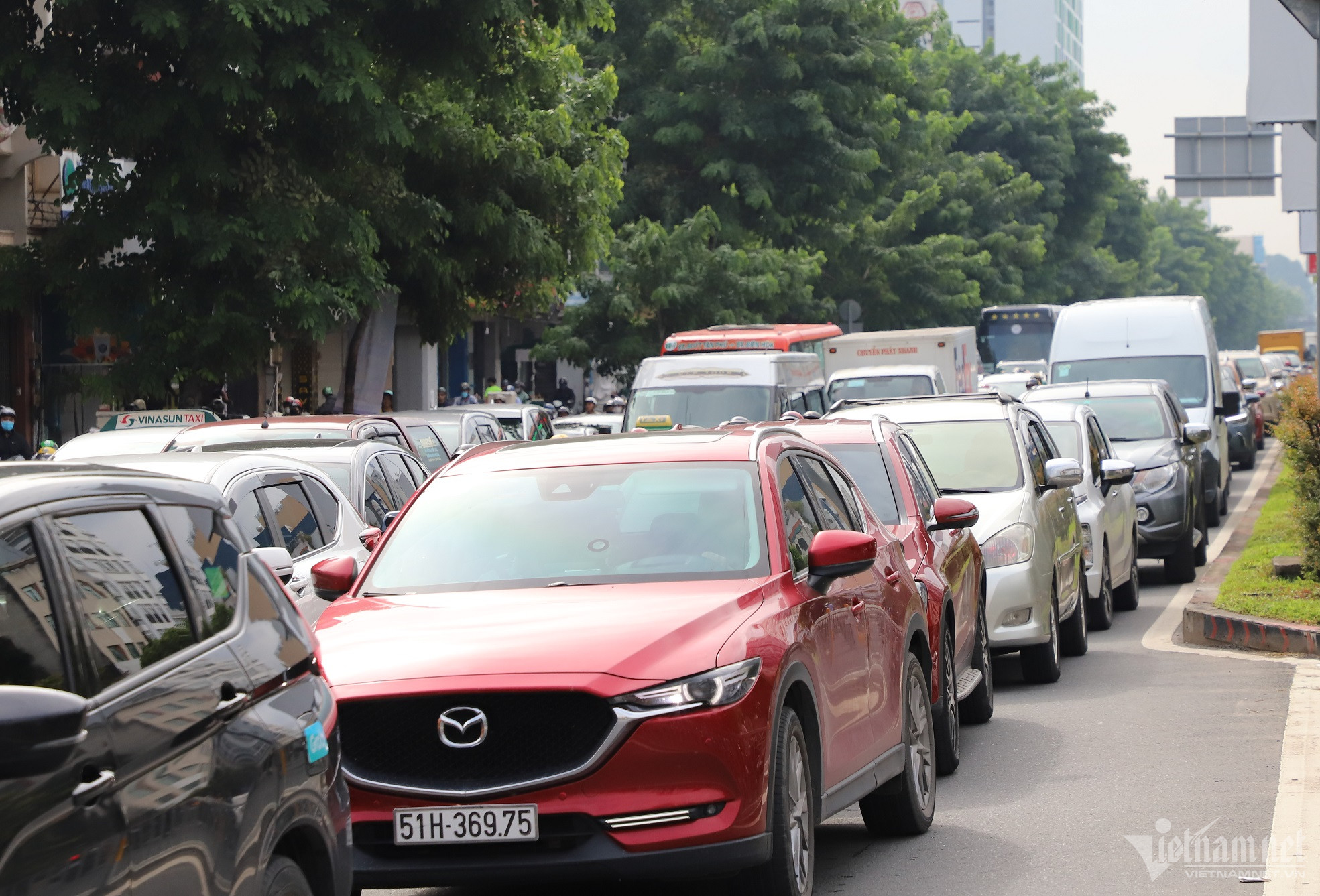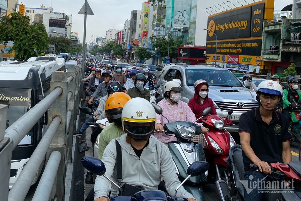 Cảnh giao thông hỗn loạn. Người đi xe máy phải len lỏi, chen ngang- dọc giữa dòng ô tô xếp hàng dài