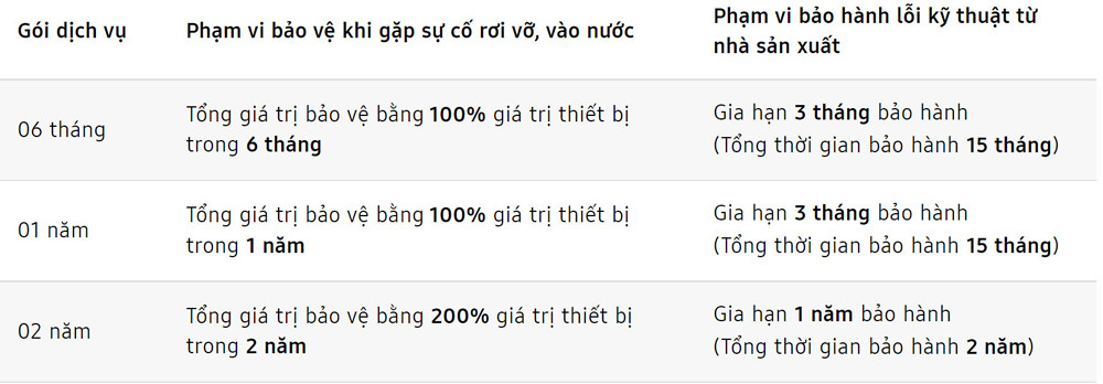 Với đặc quyền này, người dùng Samsung được hoàn toàn miễn phí sửa chữa và thay thế linh kiện chính hãng khi thiết bị (các dòng Điện thoại Samsung Galaxy A, M, S và Note series, Máy tính bảng Samsung Galaxy A và S series) gặp sự cố do rơi vỡ hoặc vào chất lỏng. Tổng giá trị bảo vệ bằng 100% giá trị thiết bị và được gia hạn thêm ba tháng bảo hành (với tổng thời gian bảo hành 15 tháng) các lỗi kỹ thuật từ nhà sản xuất, khi người dùng đăng ký gói dịch vụ từ 6 tháng.