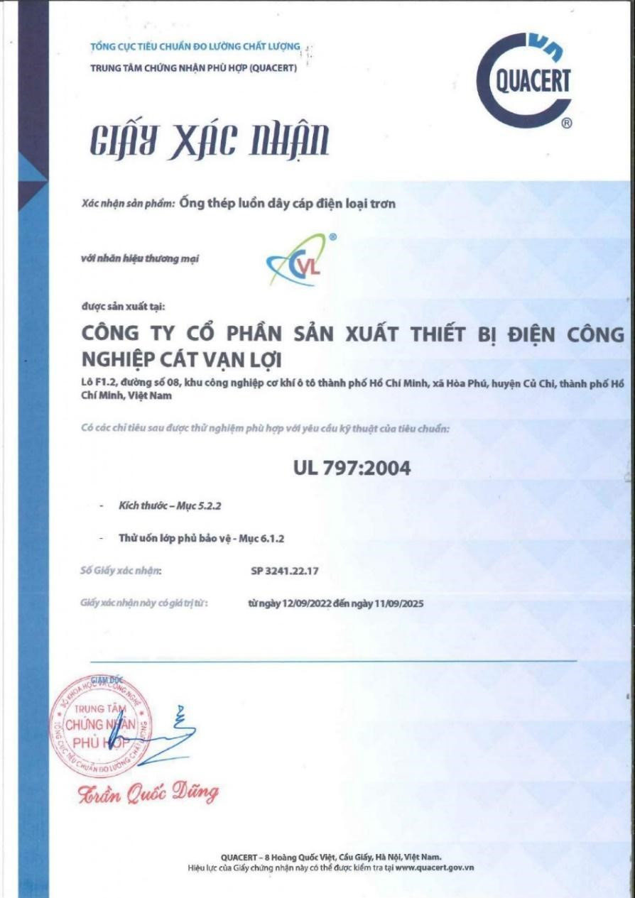Ống luồn dây điện và phụ kiện CVL được Cát Vạn Lợi sản xuất trên dây chuyền hiện đại và được kiểm soát chất lượng nghiêm ngặt từ nguyên liệu đầu vào đến sản phẩm hoàn thiện bởi hệ thống quản lý chất lượng ISO 9001: 2015, nhằm đảm bảo sự đồng nhất, ổn định chất lượng và đạt các Hợp chuẩn kỹ thuật quy định tại các quốc gia phát triển của Viện Tiêu chuẩn Quốc gia Hoa Kỳ (American National Standards Institute) ANSI C 80.1, ANSI C 80.6; Tổ chức hợp tác giữa các phòng thí nghiệm (Underwriters Laboratory) UL 797; Tiêu chuẩn công nghiệp Nhật Bản (Japanese Industrial Standards) JIS C 8305; Uỷ ban Kỹ thuật Điện Quốc tế (The International Electrotechnical Commission) IEC 61386; Tiêu chuẩn Anh quốc (British Standard) BS 4568.