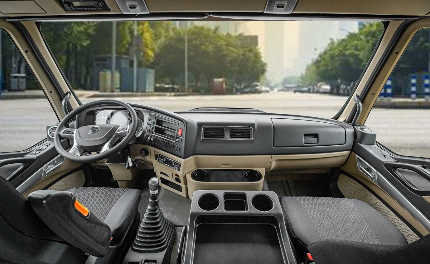 Howo 6x2 cũng gây ấn tượng với cabin được trang bị đầy đủ, tiện nghi: Cả ghế lái và ghế hành khách đều là ghế hơi, giúp giảm xóc khi di chuyển trên những cung đường gập ghềnh; Các trang bị khác như điều hòa tự động, kính điện 1 chạm, 2 cổng sạc thiết bị, cửa sổ trời thoáng gió, cruise control.