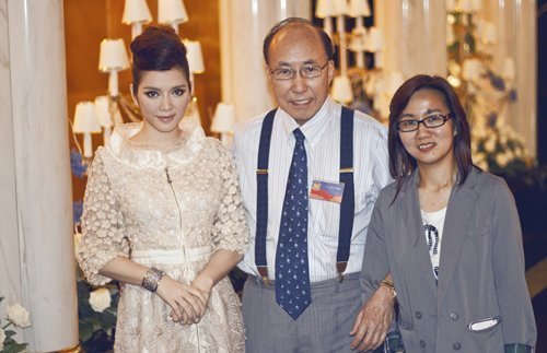 | Lý Nhà Kỳ nổi bật trong chiếc áo dài xanh tại Gala dinner tối 29/6 ở Hong Kong. Cô chụp hình cùng Thứ trưởng Bộ VHTTDL Lê Khánh Hải cùng các vị khách. |