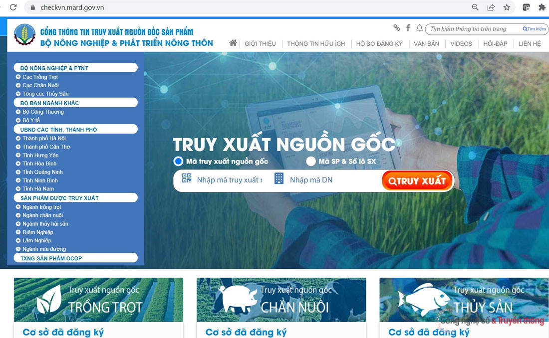 Cụ thể, hệ thống truy xuất nguồn gốc của Bộ Nông nghiệp và Phát triển Nông thôn đã được xây dựng, vận hành tại địa chỉ https://checkvn.mard.gov.vn; đã kết nối dữ liệu thông suốt với hệ thống truy xuất nguồn gốc của các địa phương là Hà Nội, Hưng Yên, Hòa Bình, Quảng Ninh, Hà Nam, Ninh Bình, Vĩnh Long, Đắc Nông, Cần Thơ. Hệ thống của các địa phương này chủ yếu do các Sở Nông nghiệp và Phát triển Nông thôn quản lý.