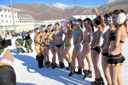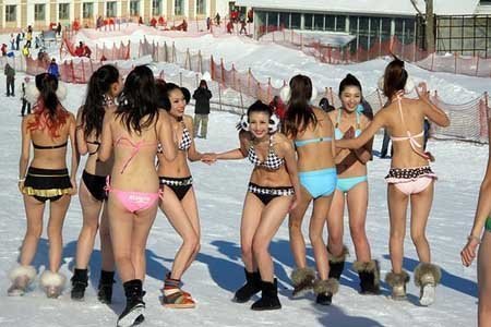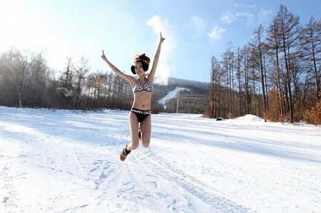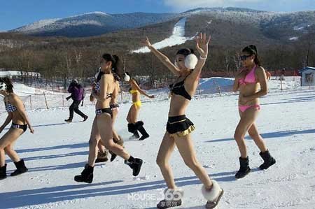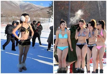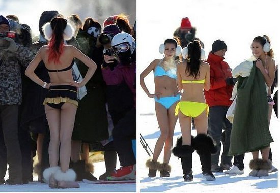 Khoảng 40 người mẫu đã dũng cảm diện những bộ bikini mát mẻ khi nhiệt độ ngoài trời xuống tới -28 độ C trong sự kiện quảng bá cho một khu nghỉ dưỡng tại Trung Quốc.