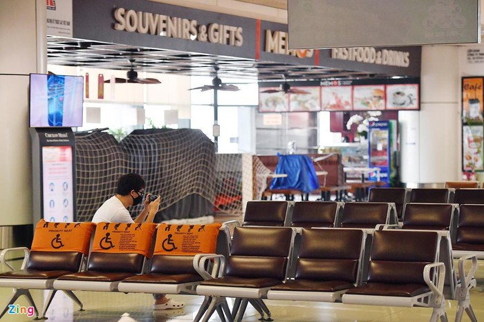 Tại phòng chờ lên máy bay Tân Sơn Nhất, cảnh vắng vẻ, tối thui chưa từng thấy trong ngày bình thường hiện ra. Chỉ tại khu vực cửa lên máy bay mới đông người ngồi chờ và sáng đèn.