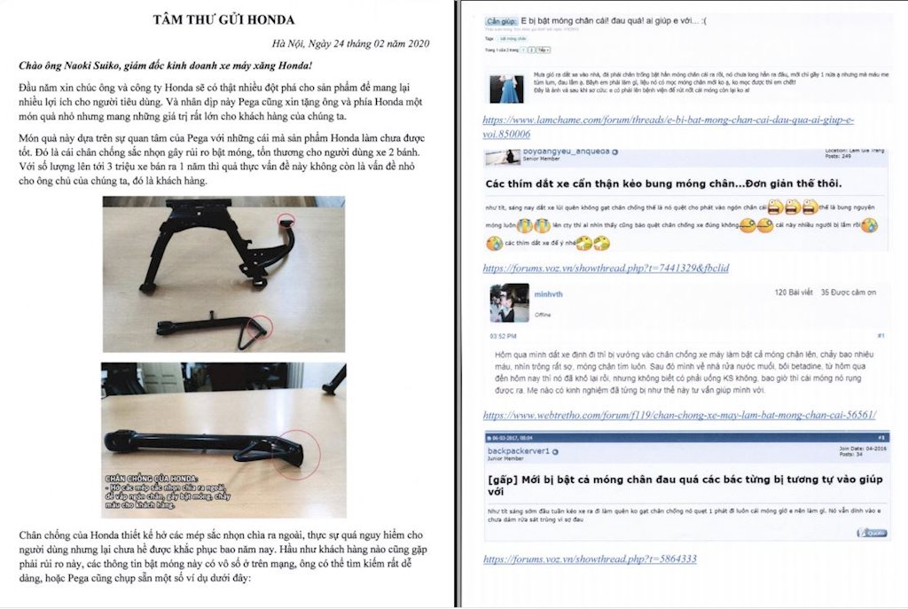 Phía Pega cho biết, họ đã gửi một bức tâm thư cùng một số món quà kèm theo đến lãnh đạo Honda Việt Nam. Trong bức thư được cho là gửi đến phía Honda Việt Nam, ông Đoàn Ngọc Linh cho biết: “Món quà này dựa trên sự quan tâm của Pega với những cái mà sản phẩm Honda làm chưa được tốt. Đó là cái chân chống sắc nhọn gây rủi ro bật móng, tổn thương cho người dùng xe 2 bánh. Với số lượng lên tới 3 triệu xe bán ra 1 năm thì quả thực vấn đề này không còn là vấn đề nhỏ cho ông chủ của chúng ta, đó là khách hàng”.