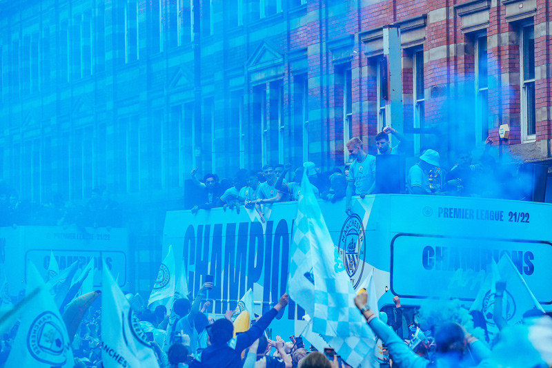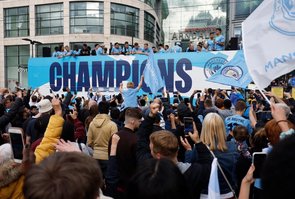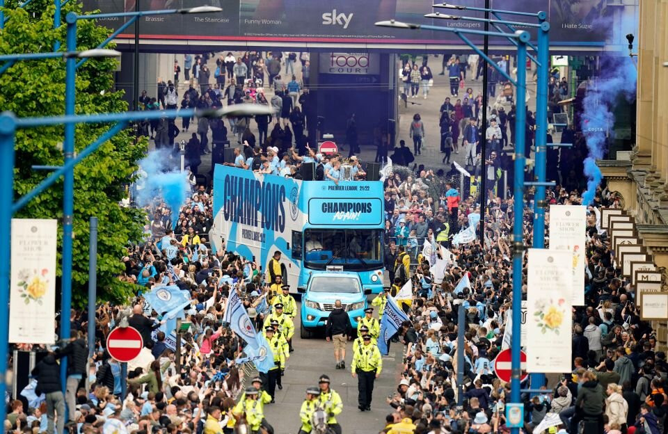 Thầy trò Pep Guardiola mở hội ăn mừng, diễu hành trên xe buýt khắp thành phố Manchester sau chiến tích đăng quang Ngoại hạng Anh 2021/22.