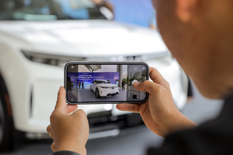 Khu vực sảnh lớn của Trung tâm Hội nghị quốc gia nhanh chóng thu hút sự chú ý của khách mời, nhờ sự xuất hiện lần đầu tiên trước công chúng của mẫu ô tô điện VinFast VF 9. Đây là một trong những lí do thu hút nhiều người tới sự kiện sớm để được tận mắt ngắm mẫu xe điện vốn trước đó chỉ được ngắm qua ảnh.